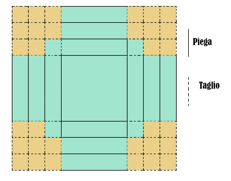 Seguite lo schema per il coperchio, ricordandovi che se volete un coperchio più alto, dovrete aumentare la dimensione di tutti i quadratini. Per quanto riguarda il quadrato centrale, aggiungete sempre mezzo centimetro in più rispetto a quello del fondo (nel mio caso, se il mio fondo è da 7,5×7,5 il mio quadrato del coperchio sarà di 8x8cm).