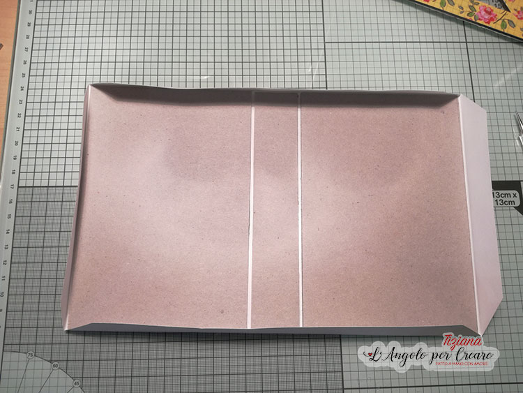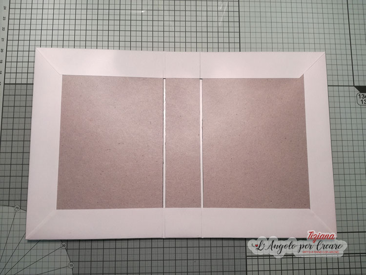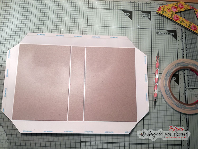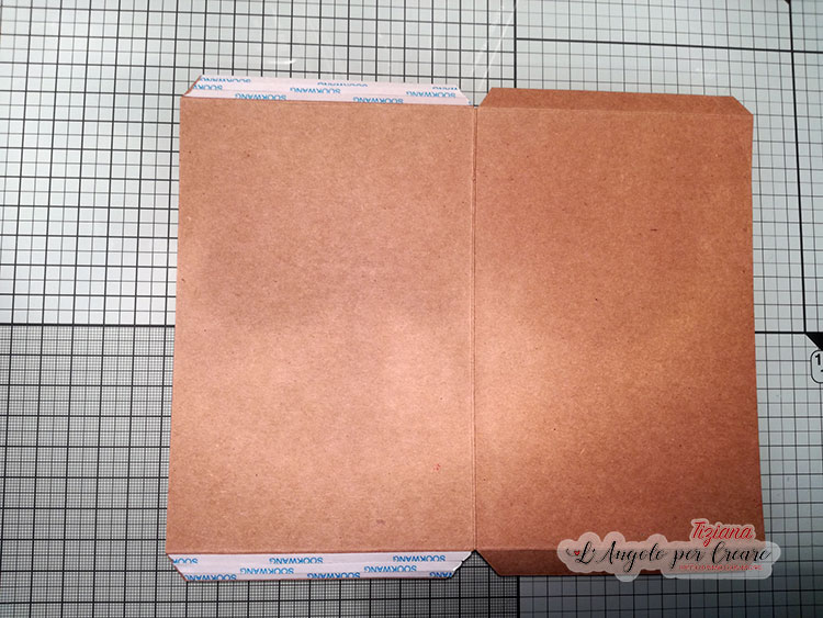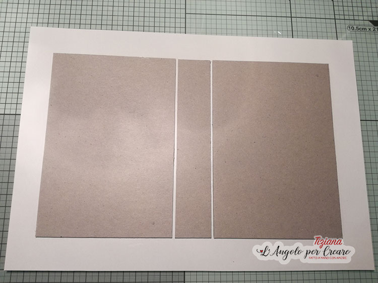 Dal cartoncino kraft tagliare 8 pezzi da 17x20cm e cordonare dal lato di 20cm a 10cm, dal lato di17cm cordonare a 1 e a 16cm.