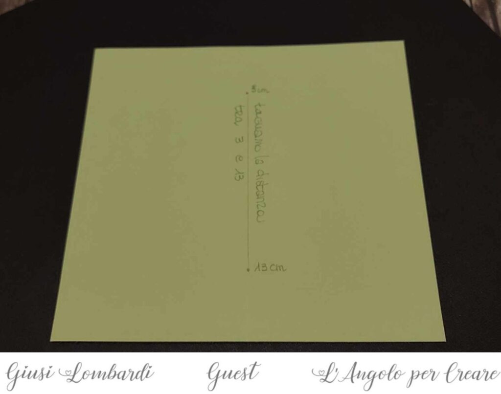 Iniziamo con il tagliare dal cardstock un pezzo da 17x16cm che farà da base alla nostra card e successivamente cordoniamo sul lato da 17cm a 8,5. Sulla cordonatura fissiamo due punti a 3 e 13 cm e con la taglierina tagliamo lo spazio tra i due punti.