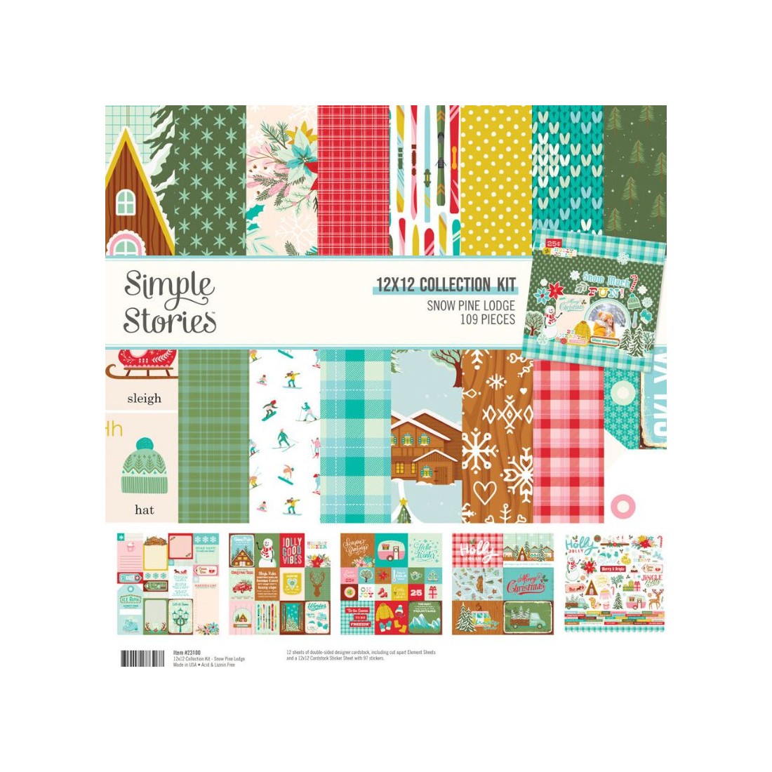 Nella confezione di carte "Snow Pine Lodge" di Simple Storie troverai 12 fogli con stampa bifacciale e un foglio che contiene 109 stickers.