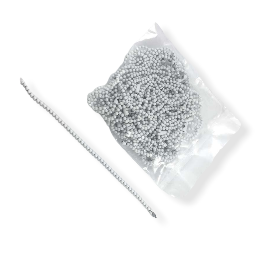 La catena è bianco opaco, misura 1.5mm e ha alle estremità i connettori che ne permettono la chiusura