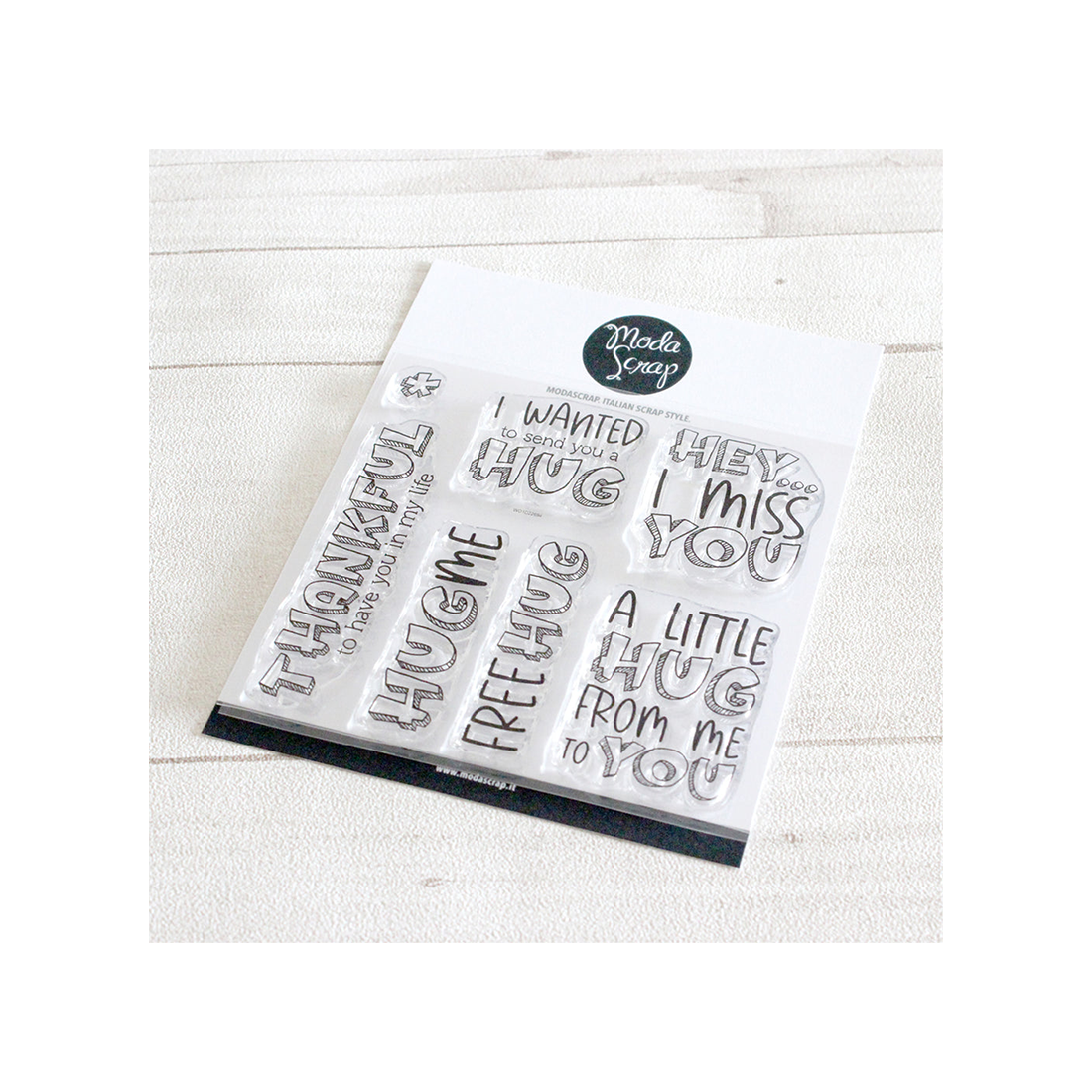 La confezione "Hug" contiene 7 timbri. Tutte frasi e parole dove il tema è amore: hug, i miss you, free hug e thankful.